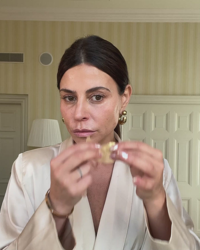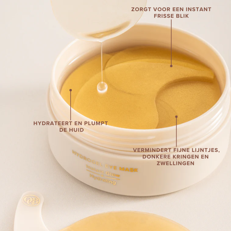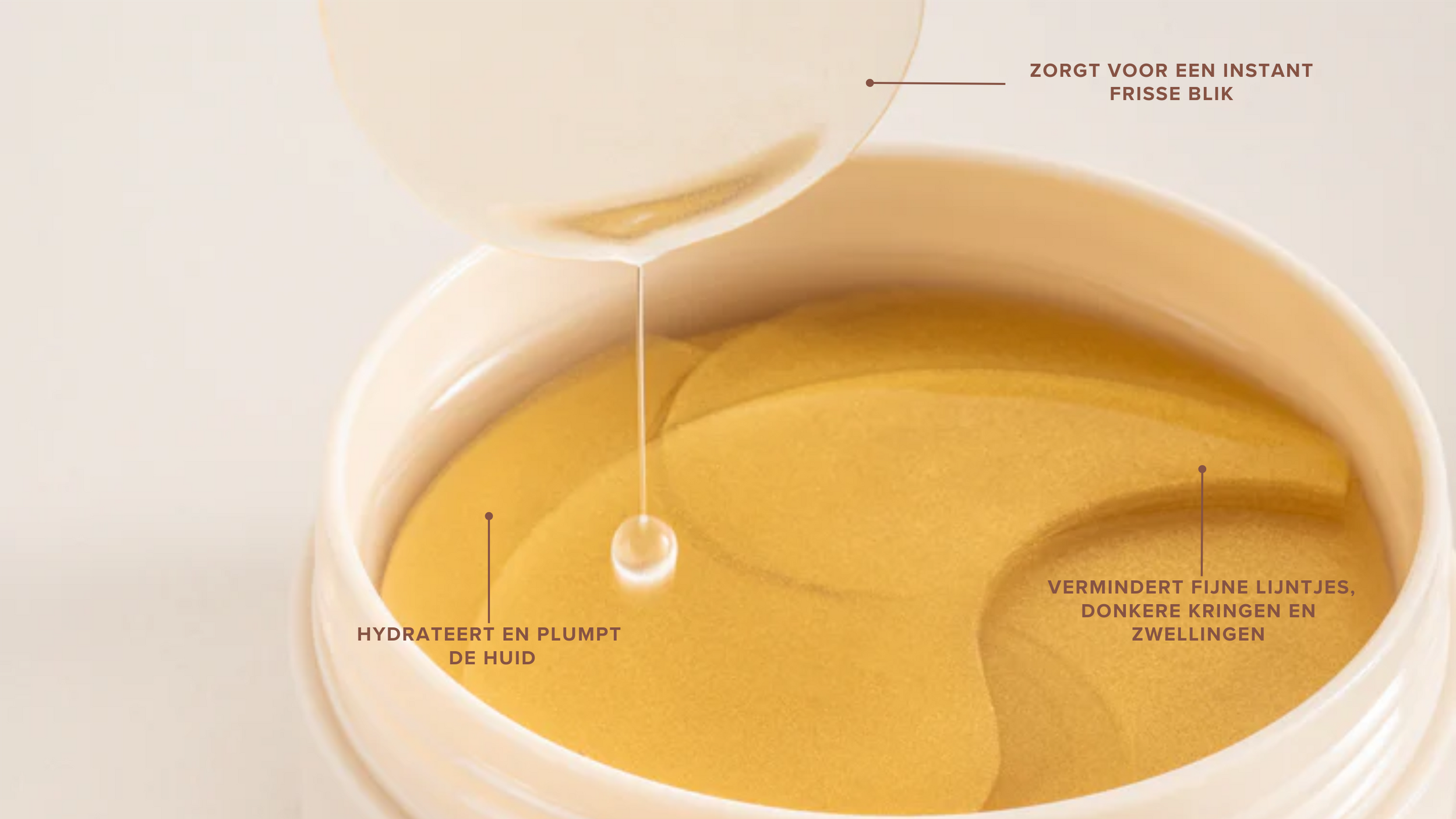De hydraterende eye patches zijn doordrenkt met een krachtige mix van ingrediënten die fijne lijntjes, kraaienpootjes en wallen zichtbaar helpen verminderen. Het oogmasker met 24 karaat goud ondersteunt de elasticiteit en stevigheid van de huid, terwijl het helpt bij het verhelderen van donkere kringen. Dankzij peptiden krijgt je huid een zichtbaar gelift effect, met als bonus een subtiele plumping boost. Squalane zorgt voor diepe hydratatie en versterkt de huidbarrière, voor een stralende blik die je meteen ziet én voelt.