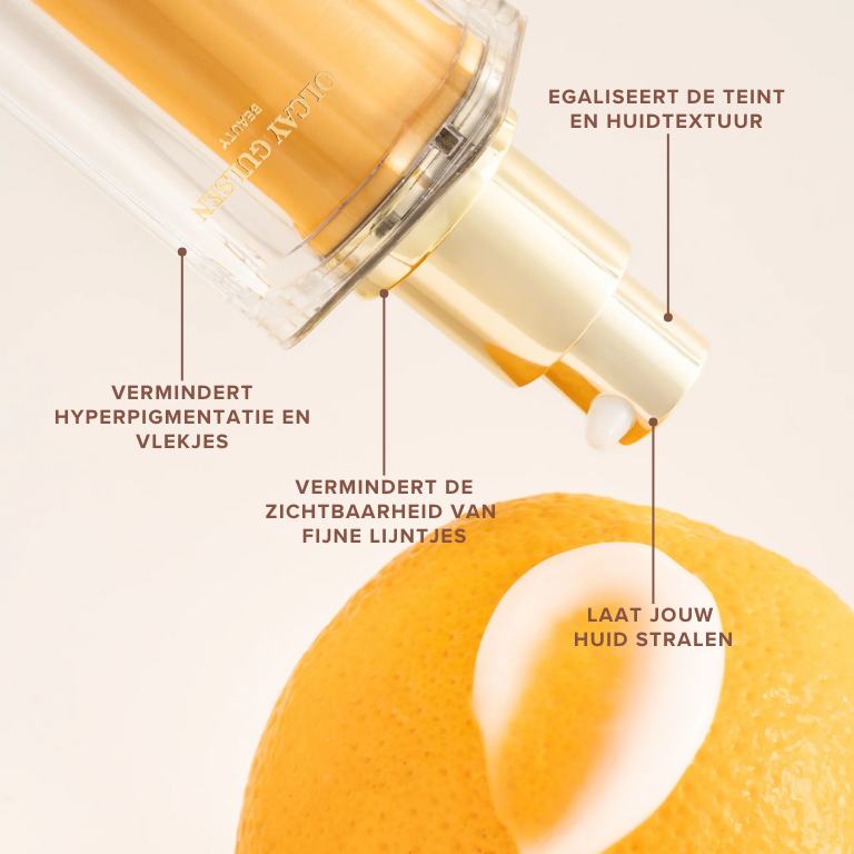 The Olcay Gulsen Beauty Miracle Vitamin C Glow Serum is fragrance-free. The serum contains a high dose of Vitamin C, therefore make sure to patch test it first to check if you have any sensitivity to this ingredient. Apply a small amount on your jaw and leave it on for a day. If any redness or irritation appears, please contact our customer service first before using it on the rest of your face. Vitamin C can easily oxidize when exposed to heat or (sun)light, so it’s best to keep it out of the bathroom and store it somewhere dark and at room temperature.